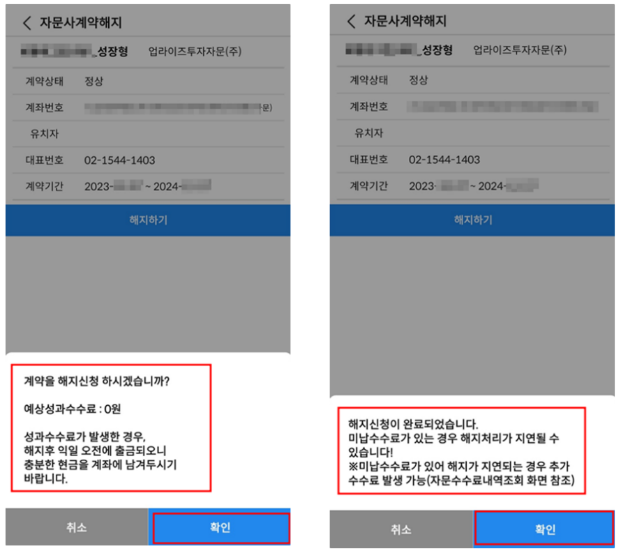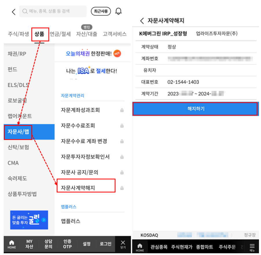 우측 하단 메뉴 > 상품 > 자문사/맵 > 자문사 계약해지 > 해지하기