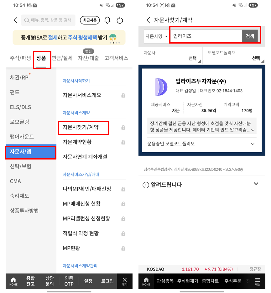 메뉴 > 상품 > 자문사/맵 > '업라이즈' 검색 >