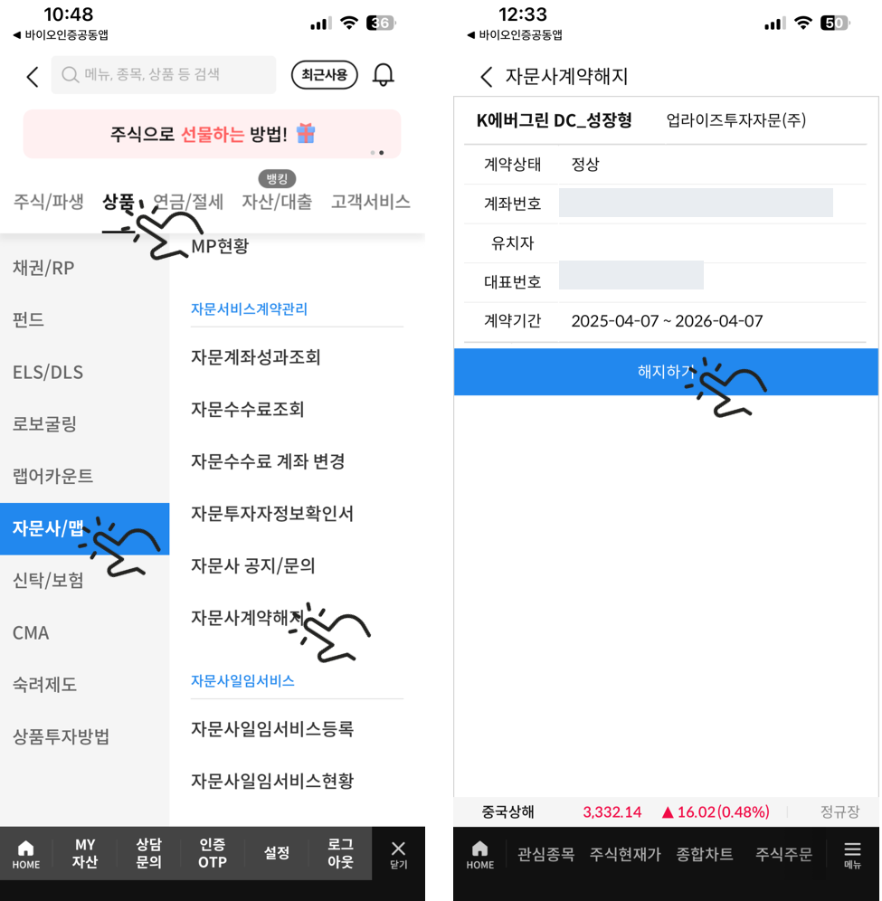 (2) [상품] > [자문사/맵] > [자문사 계약 해지] 선택