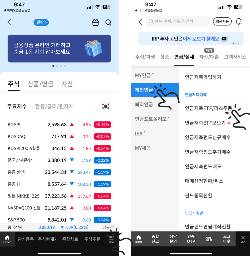 • [연금/절세] > [개인연금] > [개인연금ETF/리츠 주문] 선택