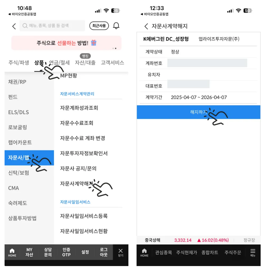 • [상품] > [자문사/맵] > [자문사 계약 해지] 선택