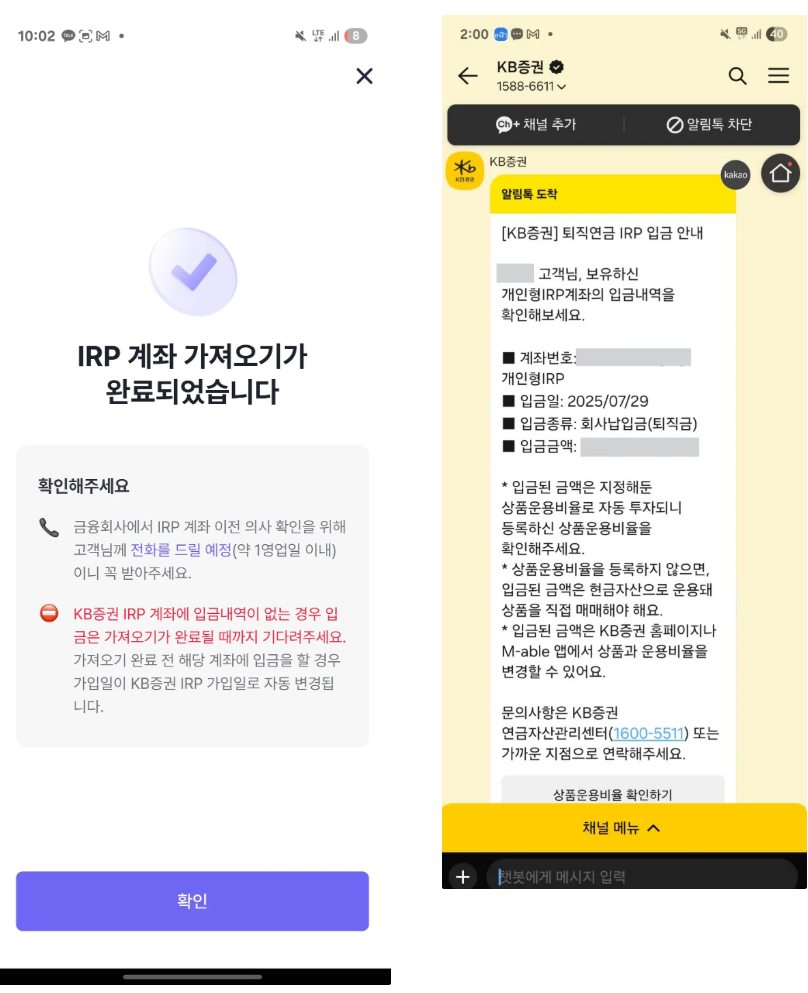• KB증권 IRP 계좌에 입금내역이 없는 경우 입금은 가져오기가 완료 될때까지 기다려 주세요.