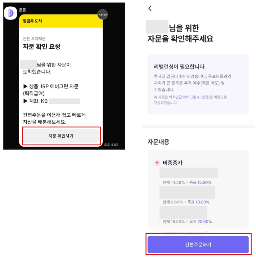 • 카카오톡 메시지 내 ‘자문 확인하기’버튼을 클릭하시면 자문 포트폴리오에 맞춰 매매를 진행하실 수 있습니다.