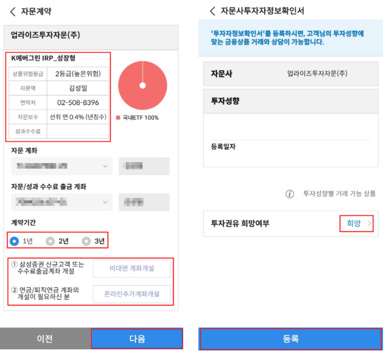 투자권유 희망여부에 '희망'을 선택해 주셔야 자문계약이 가능합니다.