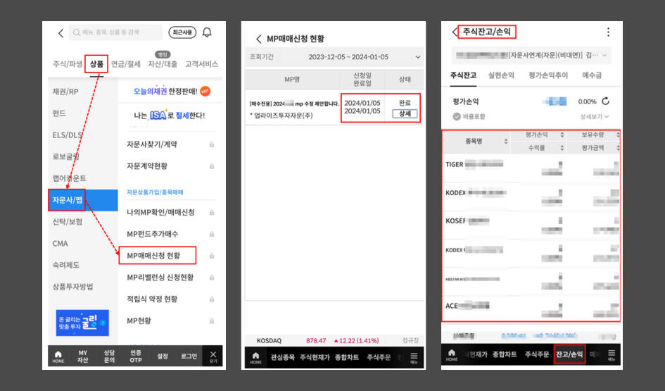 삼성증권 앱 실행 > 금융상품/자산관리 > 자문사 서비스 > 나의 MP확인/매매신청 선택
