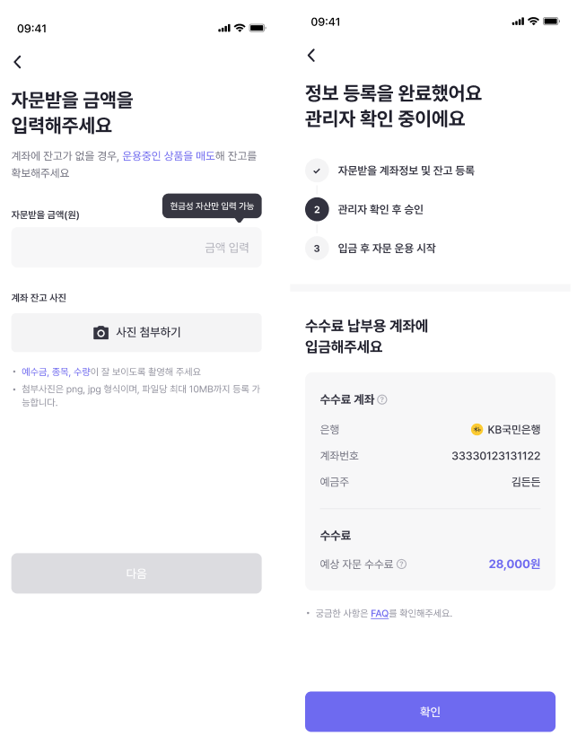 고객님께서 자문을 받으실 금액과 계좌 잔고를 입력해 주세요.정확한 확인을 위해 해당 계좌의 잔고가 보이는 화면을 캡처해 함께 업로드해 주셔야 합니다.