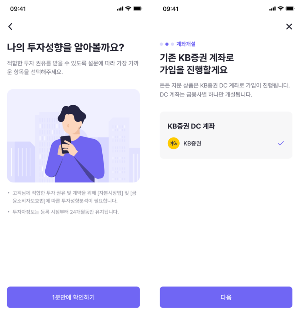 든든 앱에서 DC 에버그린 자문 (KB증권 전용) 상품을 선택한 후, 투자 성향 설문을 완료해 주세요.