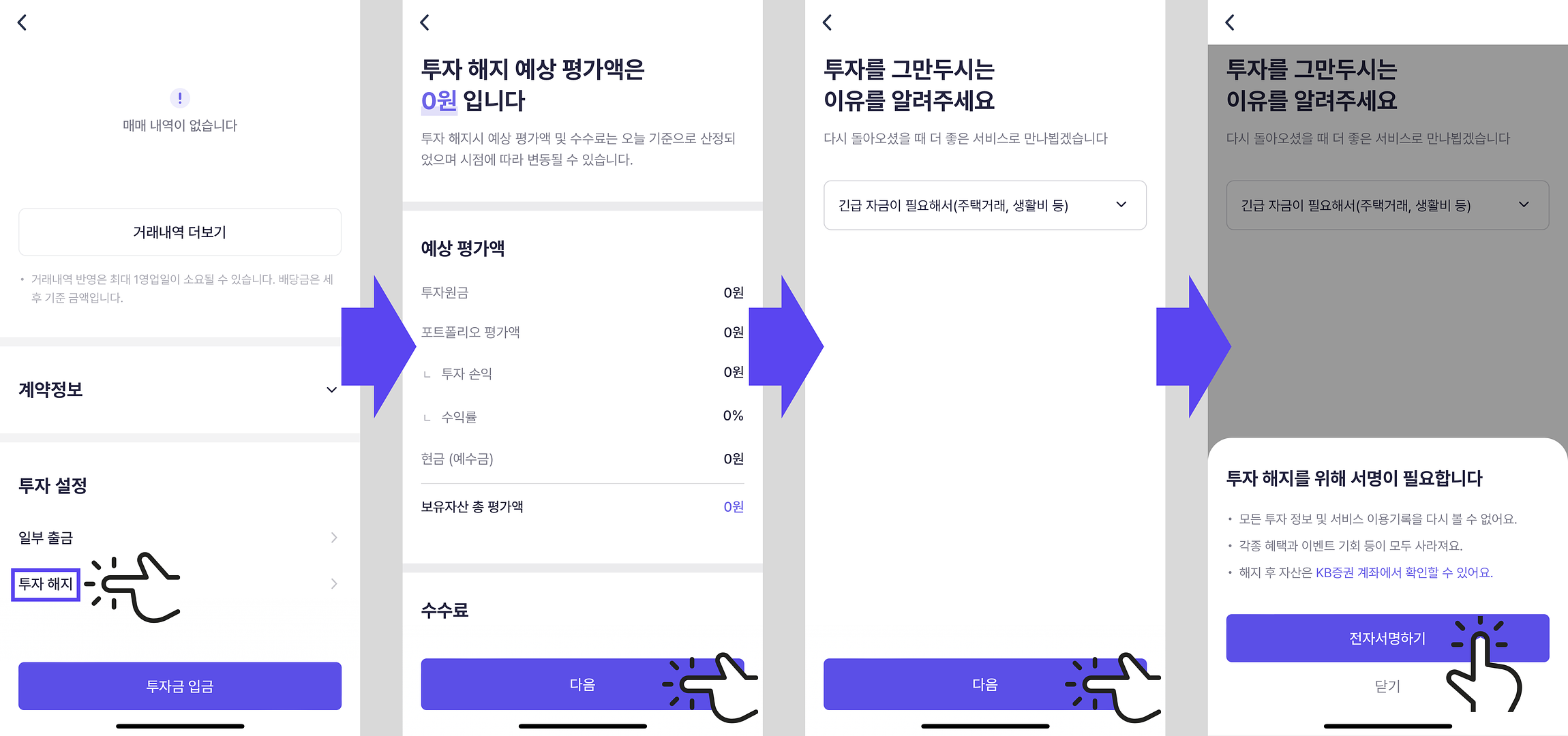 해지 신청(신청 접수 완료 시 카카오톡 발송) → 해지 신청 후 1영업일 이내 고객센터를 통한 달러출금 요청 → 보유 종목 전량 매도(영업일 기준 해지 신청일 +1영업일) → 매도 확인 후 고객센터를 통한 결제예정일 안내&일임계약 해지 처리